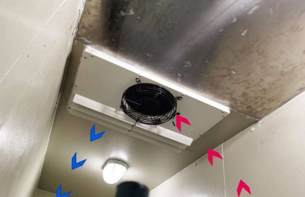 按照蒸發(fā)管裝置的方式又可分直接冷卻和間接冷卻兩種。直接冷卻將蒸發(fā)管安裝在冷藏庫房?jī)?nèi),液態(tài)冷卻劑經(jīng)過低壓蒸發(fā)管時(shí),直接吸收庫房?jī)?nèi)的熱量而降溫。間接冷卻是由鼓風(fēng)機(jī)將庫房?jī)?nèi)的空氣抽吸進(jìn)空氣冷卻裝置,空氣被盤旋于冷卻裝置內(nèi)的蒸發(fā)管吸熱后,再送入庫內(nèi)而降溫。空氣冷卻方式的優(yōu)點(diǎn)是冷卻迅速,庫內(nèi)溫度較均勻,同時(shí)能將貯藏過程中產(chǎn)生的二氧化碳等有害氣體帶出庫外。